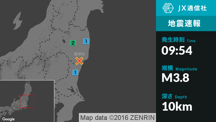 | 震度1 | 郡山市, 白河市, 鏡石町, 石川町, 玉川村, 古殿町, いわき市, 楢葉町, 日立市, 常陸太田市, 高萩市, 北茨城市, 常陸大宮市, 大子町 |
