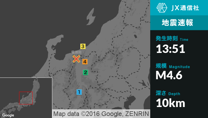 | 震度3 | 長野市, 大町市, 糸魚川市, 上越市 |