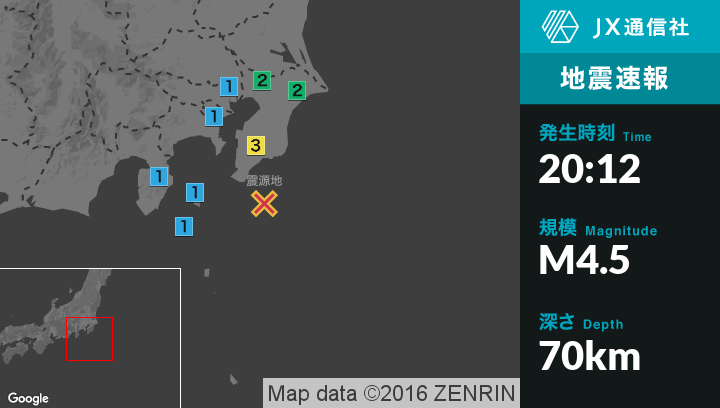| 震度1 | 木更津市, 富津市, 御宿町, 東金市, 山武市, 大網白里市, 睦沢町, 長生村, 長南町, 千葉中央区, 千葉花見川区, 千葉稲毛区, 千葉美浜区, 東京千代田区, 東京江戸川区, 伊豆大島町, 東京利島村, 横浜中区, 横浜港南区, 川崎宮前区, 横須賀市, 平塚市, 三浦市, 東伊豆町, 河津町 |