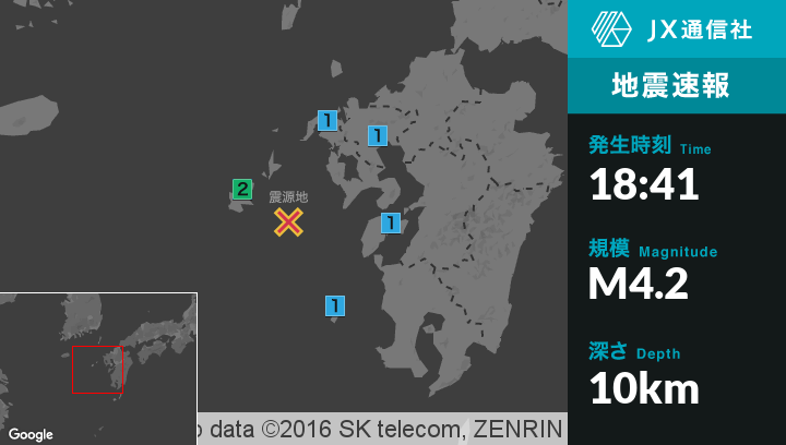 | 震度1 | 平戸市, 松浦市, 上峰町, 天草市, 薩摩川内市甑島 |