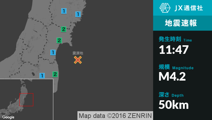 | 震度2 | 登米市, 栗原市, 大崎市, 南三陸町, 石巻市, 東松島市, 女川町, 相馬市 |
