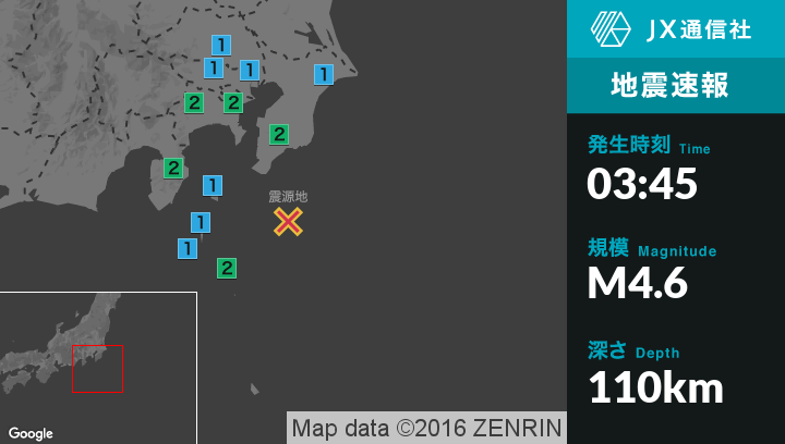 | 震度1 | 勝浦市, 君津市, 富津市, 一宮町, 三宅村, 東京千代田区, 東京中央区, 東京港区, 東京新宿区, 東京品川区, 東京大田区, 調布市, 町田市, 国分寺市, 神津島村, 伊豆大島町, 東京利島村, 新島村, 横浜保土ケ谷区, 横浜磯子区, 横浜港南区, 横浜旭区, 横浜緑区, 横浜瀬谷区, 横浜泉区, 川崎中原区, 川崎宮前区, 横須賀市, 平塚市, 茅ヶ崎市, 三浦市, 海老名市, 綾瀬市, 秦野市, 中井町, 湯河原町, 愛川町, 清川村, 熱海市, 伊東市, 伊豆市, 伊豆の国市, さいたま大宮区, さいたま南区 |