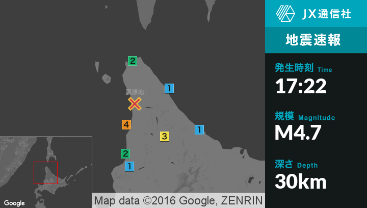 | 震度1 | 名寄市, 下川町, 美深町, 留萌市, 稚内市, 猿払村, 北竜町, 浜頓別町, 中頓別町, 宗谷枝幸町, 興部町 |