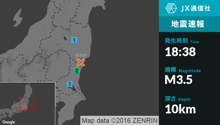 | 震度1 | 水戸市, 日立市, 高萩市, 笠間市, ひたちなか市, 常陸大宮市, 土浦市, 矢祭町 |