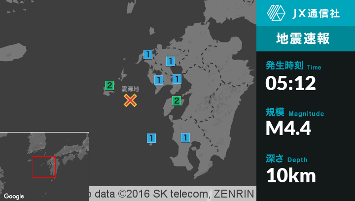 | 震度1 | 新上五島町, 佐世保市, 平戸市, 松浦市, 長崎市, 諫早市, 西海市, 南島原市, 水俣市, 上天草市, 佐賀市, 武雄市, 上峰町, いちき串木野市, さつま町, 長島町, 薩摩川内市甑島 |