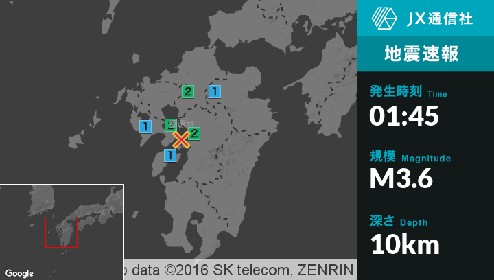 | 震度1 | 久留米市, 柳川市, 八女市, 大木町, 雲仙市, 諫早市, 熊本西区, 熊本北区, 荒尾市, 山鹿市, 菊池市, 宇土市, 宇城市, 玉東町, 南関町, 長洲町, 和水町, 益城町, 上天草市, 日田市 |