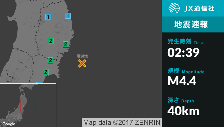 | 震度2 | 釜石市, 一関市, 気仙沼市, 南三陸町, 石巻市, 女川町 |