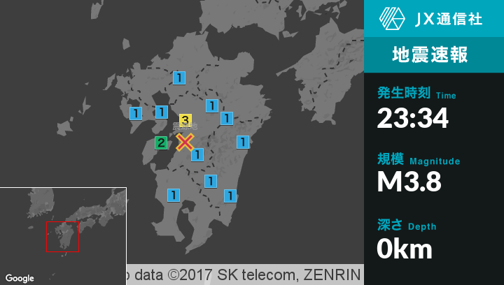 | 震度2 | 熊本西区, 熊本南区, 宇土市, 宇城市, 熊本美里町, 山都町, 氷川町, 上天草市 |