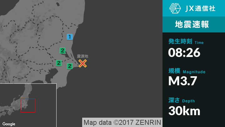 | 震度2 | 茨城鹿嶋市, 潮来市, 稲敷市, 神栖市, 旭市, 匝瑳市, 香取市, 多古町, 成田市 |