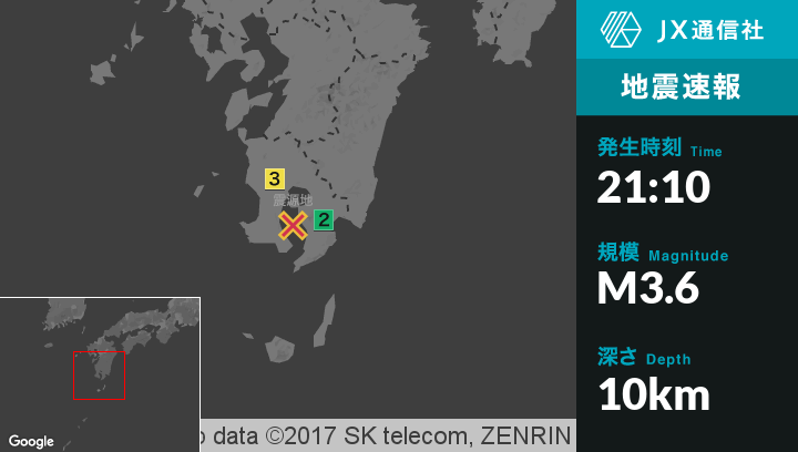 | 震度2 | 枕崎市, 指宿市, 薩摩川内市, 日置市, 南さつま市, 南九州市, 鹿屋市, 大崎町 |