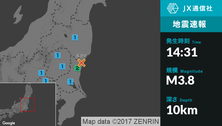 | 震度1 | 常陸太田市, 北茨城市, 笠間市, 常陸大宮市, 大子町, 土浦市, 筑西市, 玉川村, 日光市, 宇都宮市, 栃木市, 鹿沼市, 那須烏山市, 芳賀町, 栃木那珂川町, 渋川市, 加須市 |