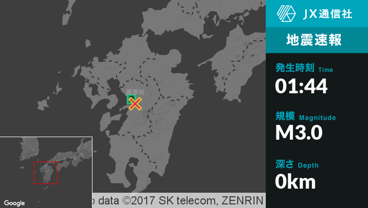 | 震度1 | 熊本西区, 熊本南区, 八代市, 熊本美里町, 嘉島町, 氷川町 |