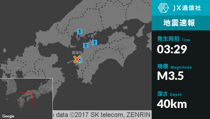 | 震度1 | 呉市, 今治市, 西条市, 松山市, 久万高原町, 砥部町, 宇和島市, 八幡浜市, 大洲市, 西予市, 内子町, 伊方町, 松野町, 愛媛鬼北町 |