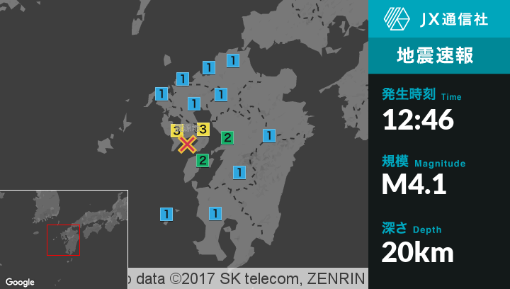| 震度1 | 大村市, 西海市, 島原市, 平戸市, 八代市, 玉名市, 宇土市, 宇城市, 熊本美里町, 玉東町, 水俣市, 芦北町, 人吉市, 五木村, 球磨村, あさぎり町, 福岡中央区, 福岡西区, 糸島市, 飯塚市, 大牟田市, 柳川市, みやま市, 大木町, 唐津市, 佐賀市, 武雄市, 神埼市, 上峰町, 白石町, 太良町, 椎葉村, 伊佐市, 長島町, 薩摩川内市甑島 |