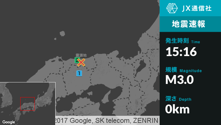 | 震度1 | 湯梨浜町, 北栄町, 真庭市, 鏡野町 |