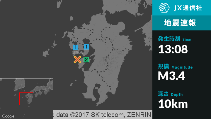 | 震度1 | 上天草市, 苓北町, 長崎市, 諫早市, 雲仙市, 南島原市 |