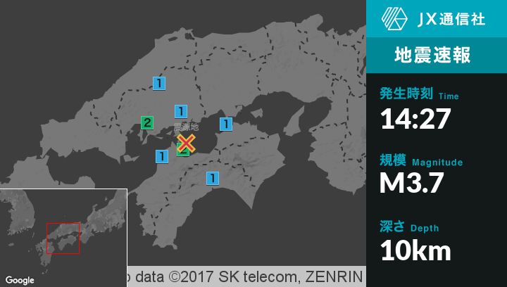 | 震度1 | 呉市, 竹原市, 東広島市, 安芸高田市, 三原市, 尾道市, 西条市, 松山市, 三豊市, 土佐町 |