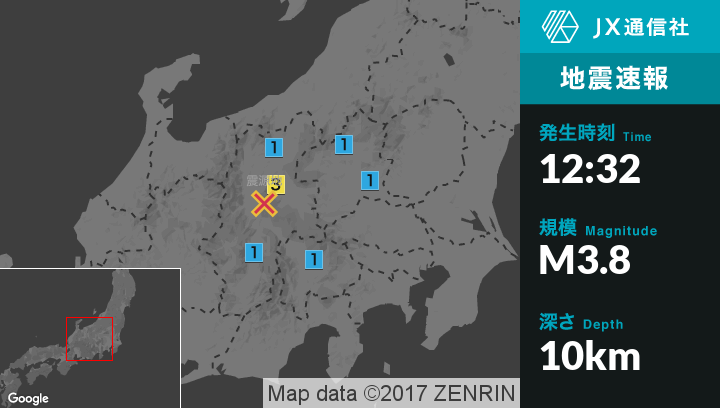 | 震度1 | 佐久穂町, 青木村, 筑北村, 大町市, 伊那市, 辰野町, 東吾妻町, 渋川市, 富岡市, 安中市, 山梨北杜市 |