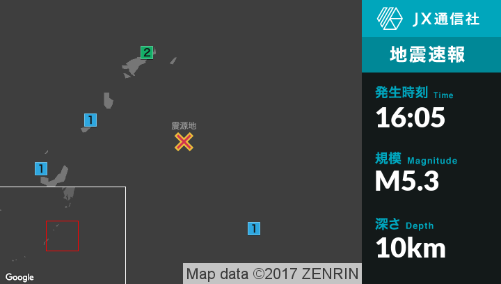 | 震度1 | 大和村, 宇検村, 喜界町, 鹿児島十島村, 天城町, 伊仙町, 和泊町, 知名町, 与論町, 名護市, 国頭村, 北大東村 |