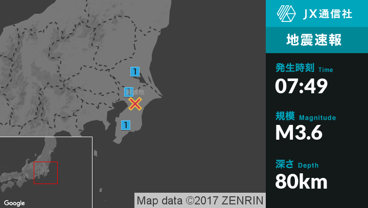 | 震度1 | 坂東市, 千葉中央区, 千葉稲毛区, 千葉美浜区, 野田市, 市原市, 君津市 |