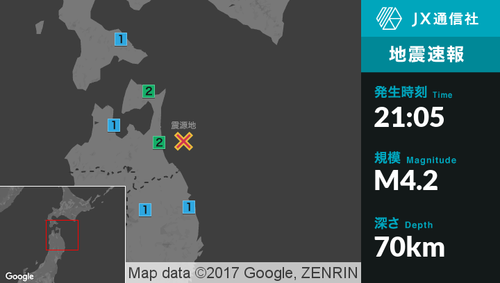 | 震度1 | 八戸市, 野辺地町, 横浜町, 東北町, 三戸町, 五戸町, 青森南部町, むつ市, 平内町, 函館市, 久慈市, 岩手洋野町, 二戸市, 軽米町, 九戸村 |