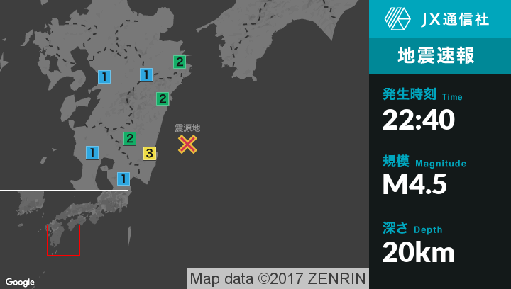 | 震度1 | 日南市, 串間市, 綾町, 延岡市, 日向市, 西都市, 新富町, 木城町, 川南町, 宮崎都農町, 小林市, 三股町, 高千穂町, 宇土市, 熊本美里町, 益城町, 鹿児島市, 霧島市, 姶良市, 鹿屋市, 志布志市, 錦江町 |