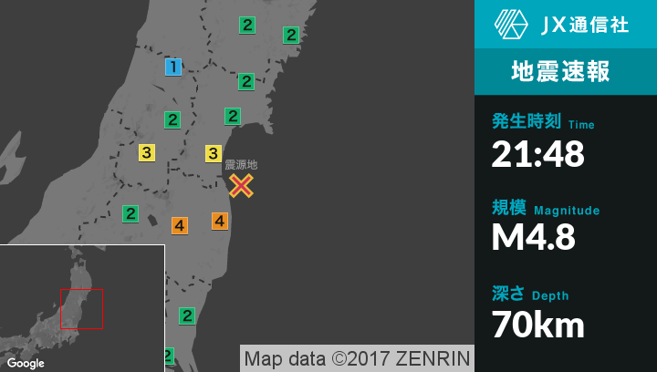 | 震度2 | 西郷村, 棚倉町, 矢祭町, 塙町, 鮫川村, 平田村, 富岡町, 大熊町, 会津若松市, 磐梯町, 猪苗代町, 会津坂下町, 湯川村, 会津美里町, 蔵王町, 七ヶ宿町, 村田町, 気仙沼市, 登米市, 大崎市, 宮城美里町, 南三陸町, 仙台青葉区, 仙台宮城野区, 仙台若林区, 仙台太白区, 仙台泉区, 石巻市, 塩竈市, 多賀城市, 東松島市, 富谷市, 松島町, 七ヶ浜町, 大郷町, 大衡村, 女川町, 山形川西町, 白鷹町, 上山市, 山辺町, 中山町, 大船渡市, 住田町, 一関市, 水戸市, 日立市, 常陸太田市, 高萩市, 北茨城市, 笠間市, ひたちなか市, 常陸大宮市, 那珂市, 小美玉市, 東海村, 大子町, 土浦市, 鉾田市, 大田原市, 那須町, 宇都宮市, 鹿沼市, 市貝町, 芳賀町 |