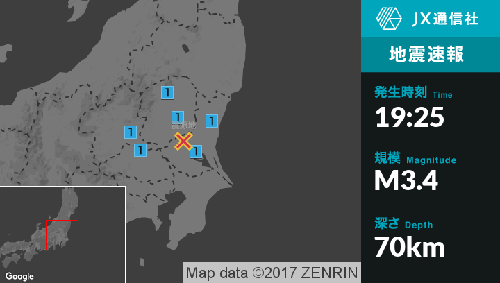 | 震度1 | 笠間市, 土浦市, 筑西市, 桜川市, 日光市, 宇都宮市, 栃木市, 佐野市, 鹿沼市, 小山市, 下野市, 野木町, 邑楽町, 加須市, 久喜市, 滑川町 |
