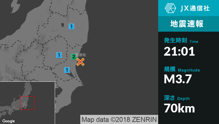 | 震度1 | 水戸市, 日立市, ひたちなか市, 常陸大宮市, 小美玉市, 大洗町, 城里町, 大子町, 土浦市, 石岡市, 茨城鹿嶋市, 筑西市, 稲敷市, かすみがうら市, 桜川市, 行方市, 鉾田市, 浅川町, 宇都宮市, 真岡市, 益子町, 茂木町 |