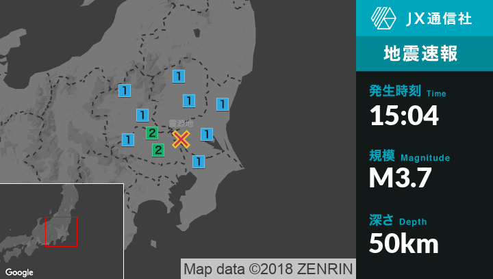 | 震度1 | 熊谷市, 本庄市, 東松山市, 鴻巣市, 深谷市, 久喜市, 滑川町, ときがわ町, 埼玉美里町, 春日部市, 上尾市, 桶川市, 北本市, 川島町, 長瀞町, 水戸市, 笠間市, 常陸大宮市, 小美玉市, 城里町, 土浦市, 石岡市, 結城市, 下妻市, 筑西市, 坂東市, 桜川市, 日光市, 宇都宮市, 足利市, 栃木市, 佐野市, 鹿沼市, 真岡市, 下野市, 上三川町, 茂木町, 野木町, 沼田市, 片品村, 前橋市, 桐生市, 伊勢崎市, 太田市, 館林市, 渋川市, みどり市, 板倉町, 群馬明和町, 千代田町, 大泉町, 邑楽町, 野田市 |