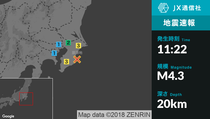 | 震度1 | 東金市, 山武市, 九十九里町, 長柄町, 館山市, 鴨川市, 富津市, 千葉中央区, 千葉花見川区, 船橋市, 松戸市, 習志野市, 鎌ケ谷市, 白井市, 東京千代田区, 東京中央区, 東京江東区, 東京江戸川区, 横浜鶴見区, 横浜中区, 横浜港北区, 川崎中原区, 川崎宮前区, 横須賀市 |
