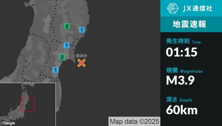 4月25日 1時15分頃発生した地震(最大震度2)