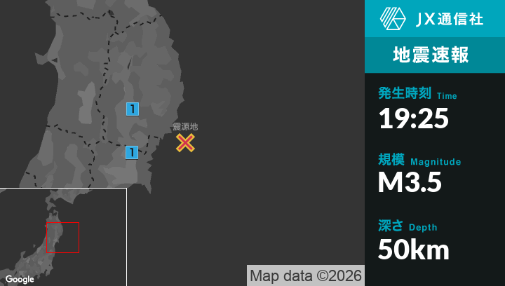 1月9日 19時25分頃発生した地震(最大震度1)