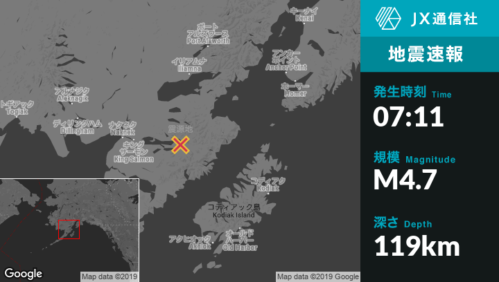 | 震源地 | アラスカのKing Salmonから東86kmの地点 |