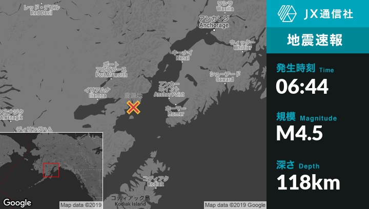 3月11日 06:44頃、アラスカのAnchor Pointから西87kmの地点でM4.5の地震がありました。