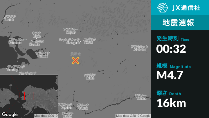 4月24日 00:32頃、アラスカのKobukから南南西67kmの地点でM4.7の地震がありました。