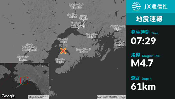 7月04日 07:29頃、アラスカのCohoeから南南東8kmの地点でM4.7の地震がありました。