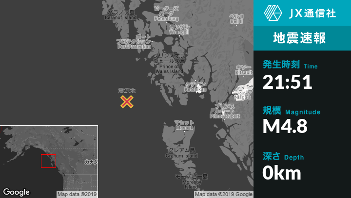 7月04日 21:51頃、アラスカのCraigから西南西122kmの地点でM4.8の地震がありました。