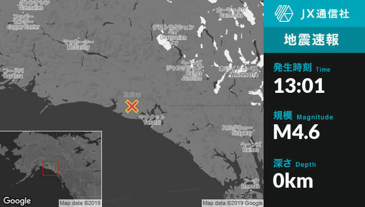 9月08日 13:01頃、アラスカのYakutatから北西74kmの地点でM4.6の地震がありました。
