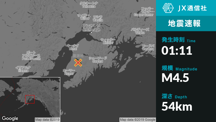 1月10日 01:11頃、アラスカのCohoeから南東31kmの地点でM4.5の地震がありました。