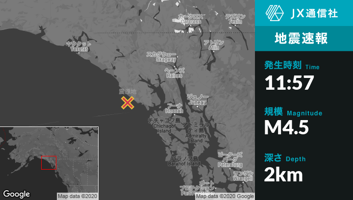 | 震源地 | アラスカのGustavusから西106kmの地点 |
