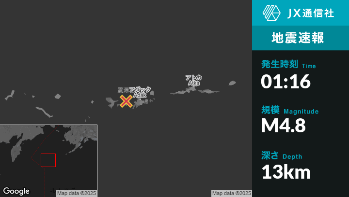 6月04日 01:16頃、アラスカのAdakから西44kmの地点でM4.8の地震がありました。