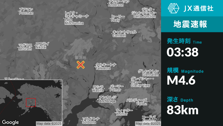 8月07日 03:38頃、アラスカのPetersvilleから西南西19kmの地点でM4.6の地震がありました。