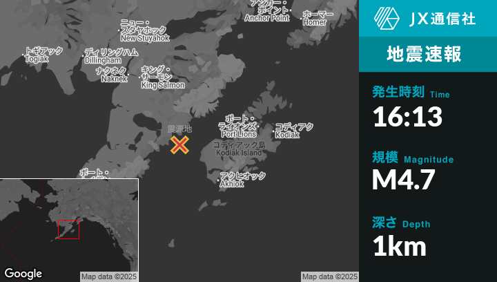 10月02日 16:13頃、アラスカのKarlukから西55kmの地点でM4.7の地震がありました。