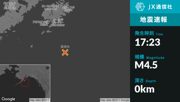 9月05日 17:23頃、アラスカのChirikof Islandから東185kmの地点でM4.5の地震がありました。
