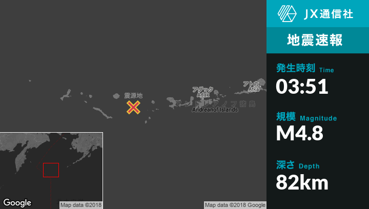 5月04日 03:51頃、アラスカのSemisopochnoi Islandから東南東57kmの地点でM4.8の地震がありました。