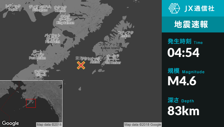 7月02日 04:54頃、アラスカのKenaiから南東5kmの地点でM4.6の地震がありました。