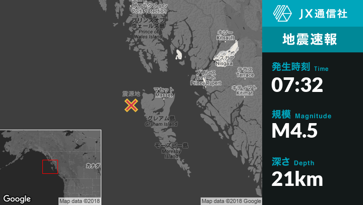 6月03日 07:32頃、カナダのMassetから西97kmの地点でM4.5の地震がありました。