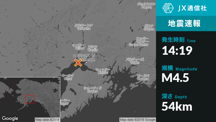 | 震源地 | アラスカのAnchorageから西33kmの地点 |