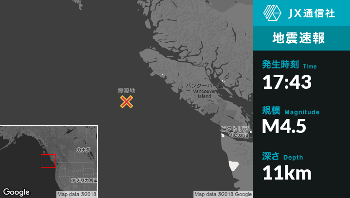 10月22日 17:43頃、カナダのPort Hardyから南西181kmの地点でM4.5の地震がありました。